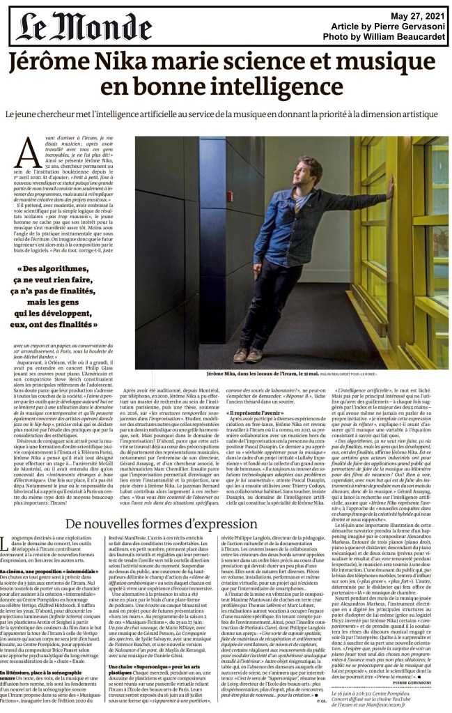 Creation, Extra features, Highlight, Medias / Press, Research by Jérôme Nika2 Jun 202118 h 27 min1 Aug 2024 Portrait in “Le Monde” by Pierre Gervasoni The article on www.lemonde.fr (May 27, 2021). Partager : Click to share on X (Opens in new window) X Click to share on Facebook (Opens in new window) Facebook Like Loading... Related