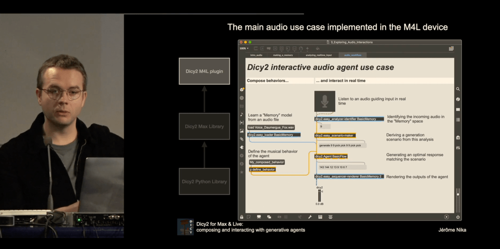 Dicy2 is a package for Max and a plugin for Ableton Live implementing interactive agents using machine-learning to generate musical sequences that can be integrated into musical situations ranging from the production of structured material within a compositional process to the design of autonomous agents for improvised interaction.